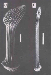 2. Spines in "regular" urchins are usually elongate and pointed. But those in "irregular urchins" (esp. sand dollars) are short and specially modified to help in moving sediment..like so...